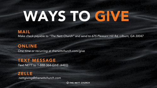 You can give by mail by making a check payable to “The Nett Church” and sending it to The Nett Church, 675 Pleasant Hill Rd. Lilburn, GA 30047